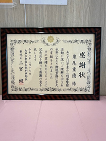 栗尾整形外科を営む栗尾 重コ 院長が県警刑事部長から感謝状を受けられました。多忙な診療の合間に昼夜を問わず臨場され、事件性の有無などの判断材料を相生署に提供されました。